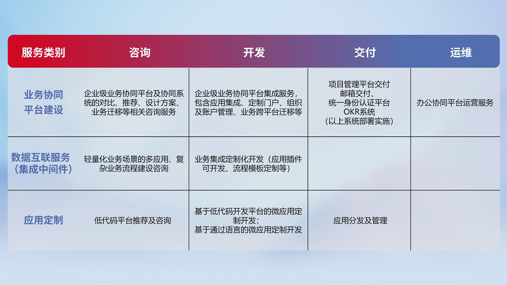 针对钉钉、、、企微、、IDaas等平台级产品提供产品的规划、、、方案、、、交付、、定制化开发等服务,,,实现如统一协同办公、、、、智能客户服务、、、、混合会议管理、、智能数据查询、、、、等业务场景,,,,实现数字化转型。。