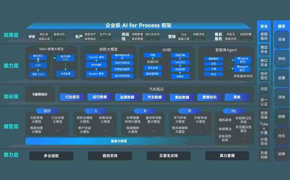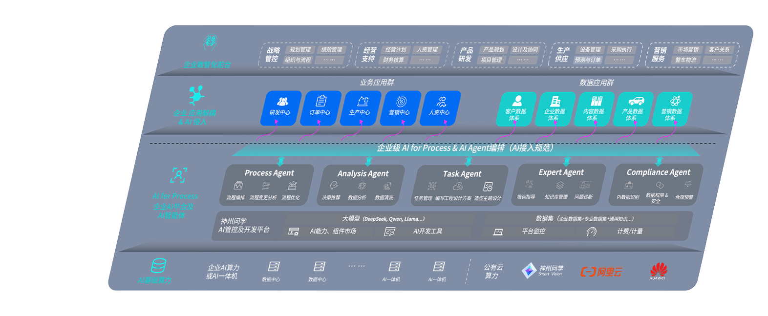 端到端的一站式AI工作空间深度融合了从企业战略规划到日常经营的全流程业务板块,,定向解决车企内部领域多、、、、部门多、、、、链条长、、场景碎片化等难题,,,支持车企快速构建以AI为核心的生产力写作体系,,,实现任务执行与AI能力的无缝集成与交互